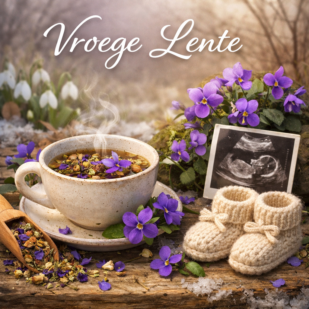 Onze februari blend "Vroege Lente" is een frisse, verhelderende thee die goed past bij het tweede trimester — de fase waarin de ergste vermoeidheid en misselijkheid meestal achter de rug zijn en je lichaam weer wat ruimte voelt.